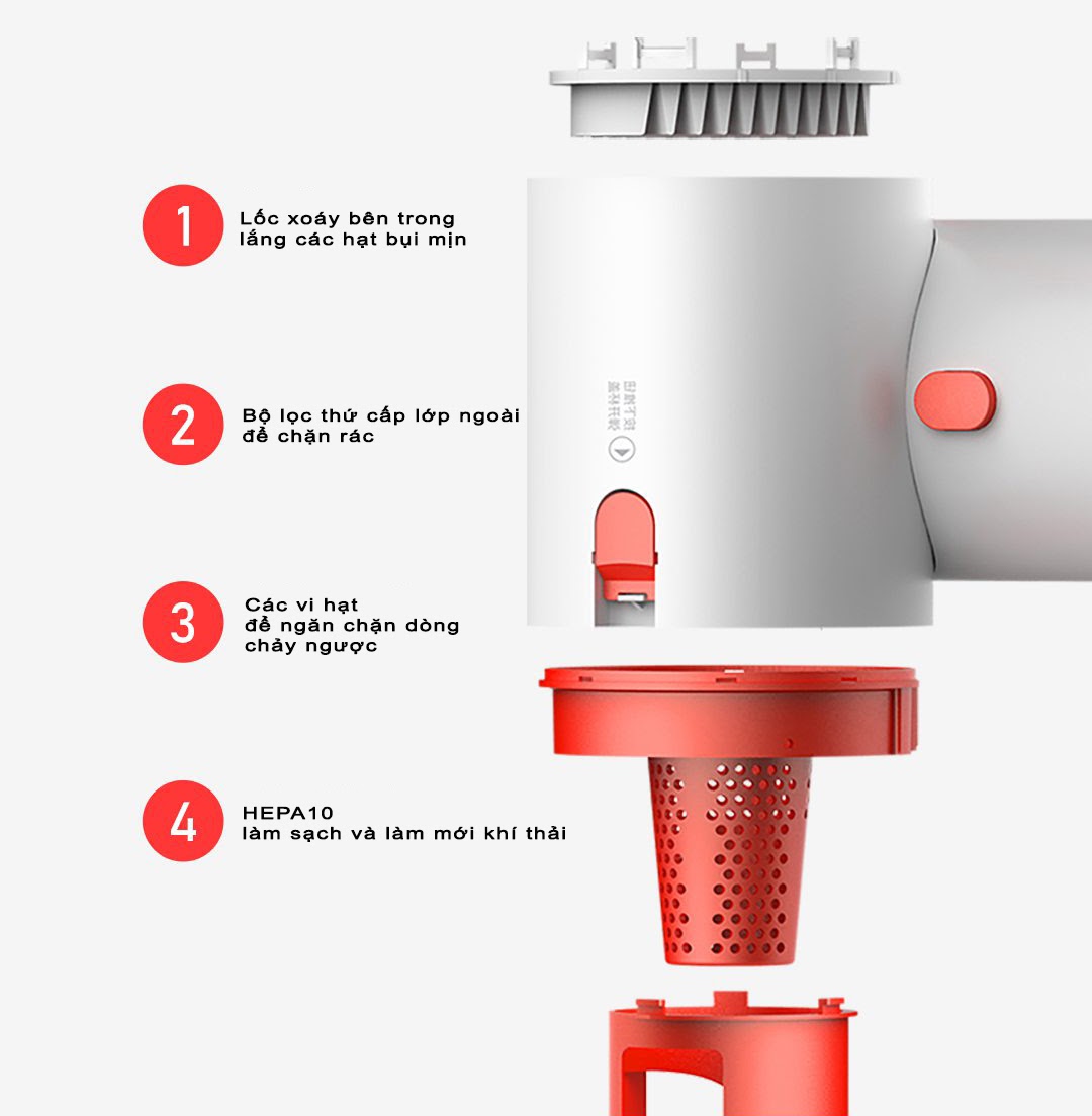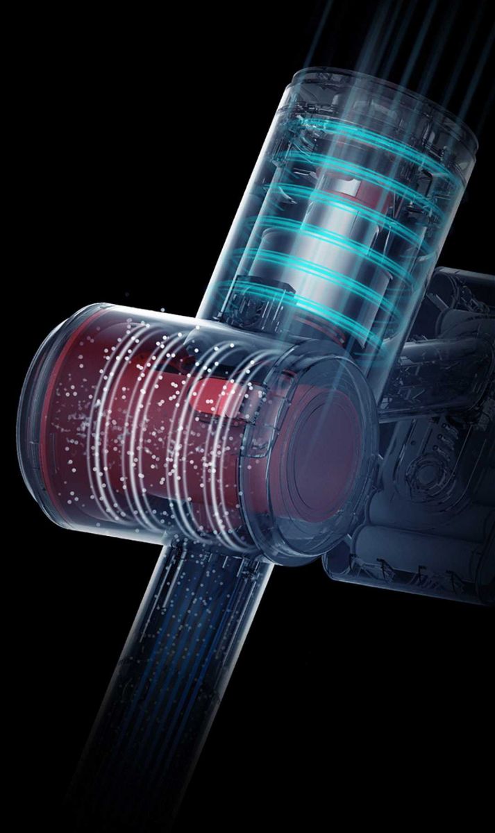 Cabin hút bụi được thiết kế theo cấu trúc xyclon hai lớp, bụi và rác được hút vào sẽ được lọc bởi các xyclon bên trong và bên ngoài liên tiếp để lắng rác và loại bỏ bụi mịn, lọc sạch các hạt bụi 0.3 µm để không làm tắc bộ phận lọc, nâng cao tuổi thọ động cơ.