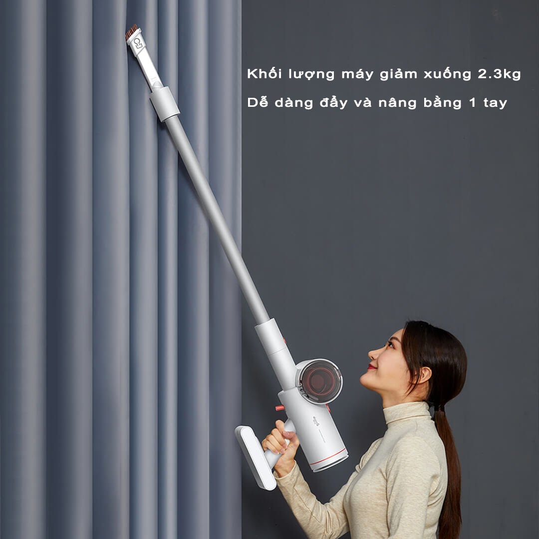Ngoài ra sau khi tối ưu hóa động cơ và pin cùng thiết kế lấy cảm hứng từ nguyên lý cân bằng đòn bẩy, thì trọng lượng của máy đã được giảm xuống còn 2.3kg, người dùng có thể dễ dàng đẩy và nâng máy chỉ bằng 1 tay, làm sạch mọi ngóc ngách nhất là ở vị trí trên cao.