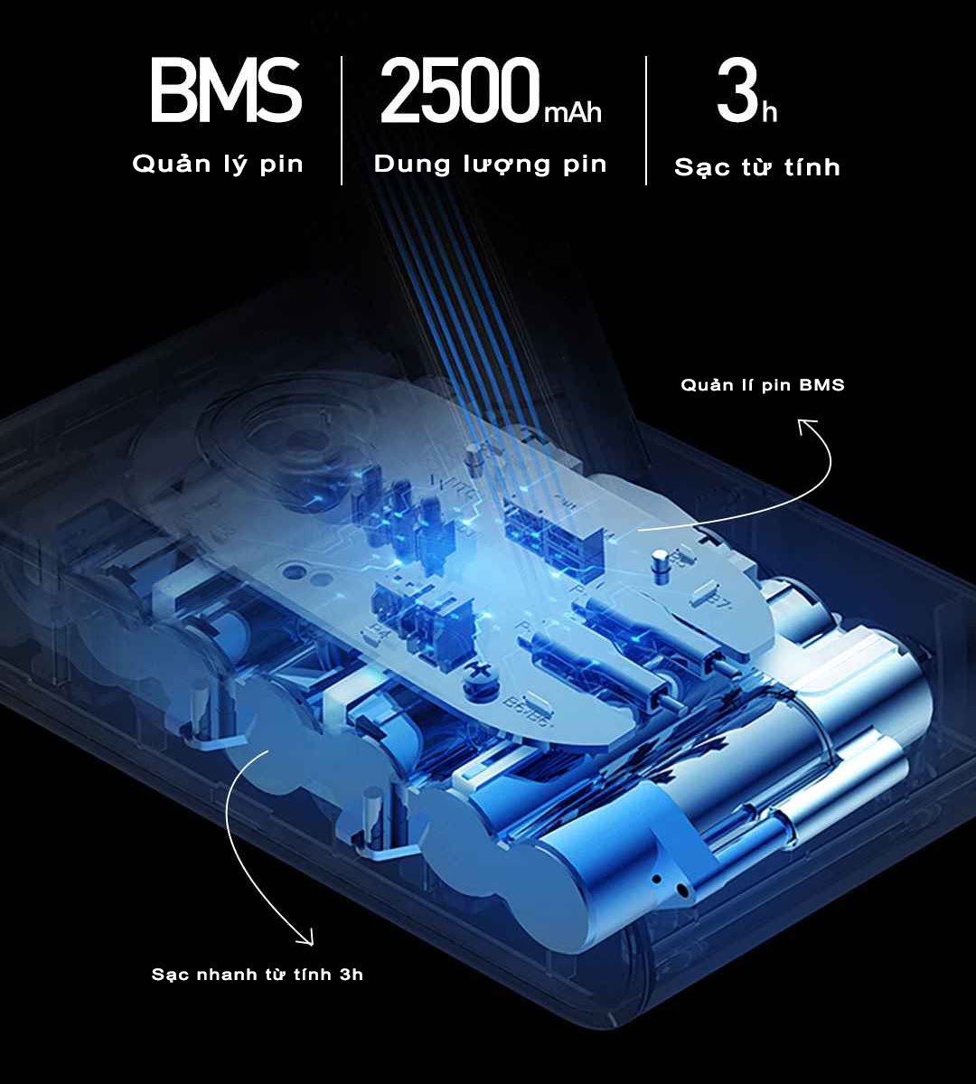 Đặc biệt, Pin được cải tiến có kích thước nhỏ nhưng dung lượng lớn hơn lên đến 2500mAh. Hệ thống quản lý pin thông minh BMS cũng được tích hợp, giúp pin không bị hao hụt, sử dụng lâu dài mà không cần thay pin.