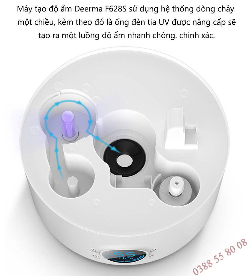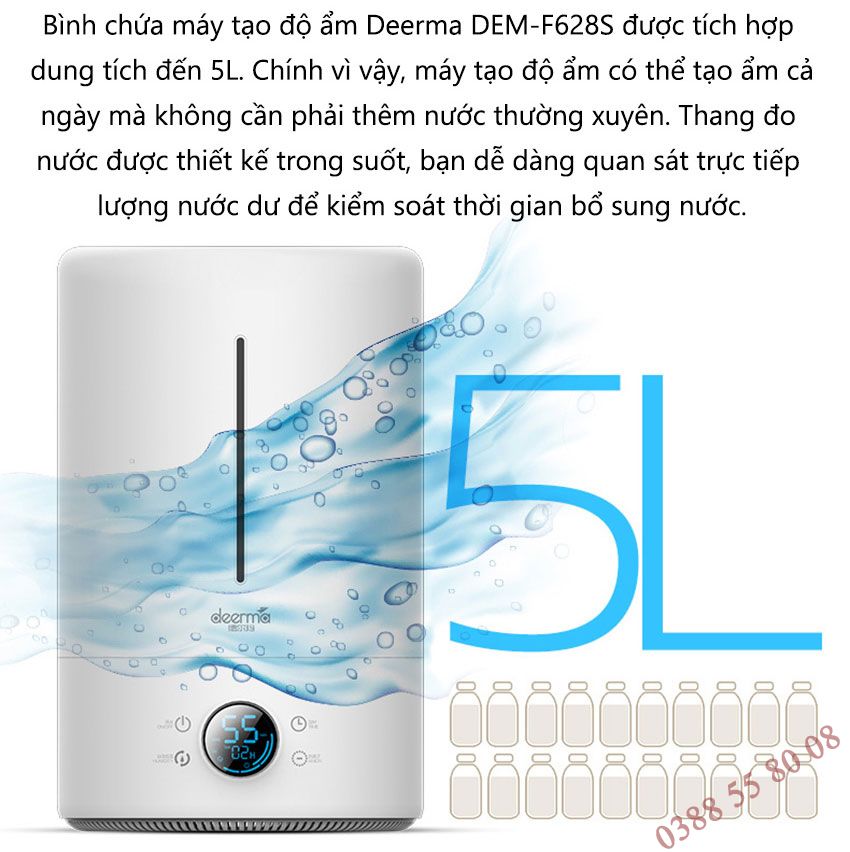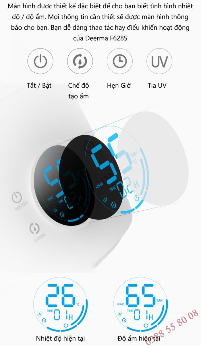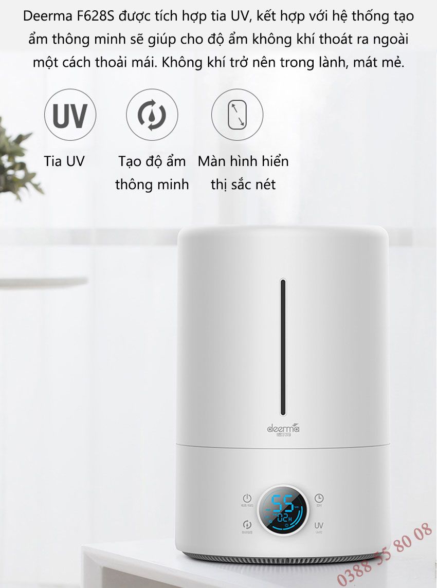 Bên cạnh chức năng phun sương, tạo ẩm cho không gian giống như các thiết bị tạo độ ẩm thông thường thì Deerma DEM-F628S lại nổi bật với nhiều cải tiến. Đáng kể nhất là những trang bị như đèn UV làm sạch nguồn nước, độ ẩm luôn giữ ở mức ổn định 45-90% tốt cho sức khỏe, dung tích bình chứa đến 5L và đặc biệt là màn hình hiển thị trực quan, dễ quan sát cho mọi người dùng.