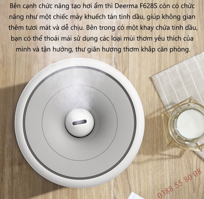 Bên cạnh chức năng tạo nguồn hơi ẩm dồi dào thì Máy tạo độ ẩm Deerma còn có chức năng như một chiếc máy khuếch tán tinh dầu, giúp không gian thêm tươi mát và dễ chịu. Bên trong là một khay chứa tinh dầu, bạn có thể thoải mái sử dụng các loại mùi thơm yêu thích của mình và tận hưởng, thư giãn hương thơm khắp căn phòng.