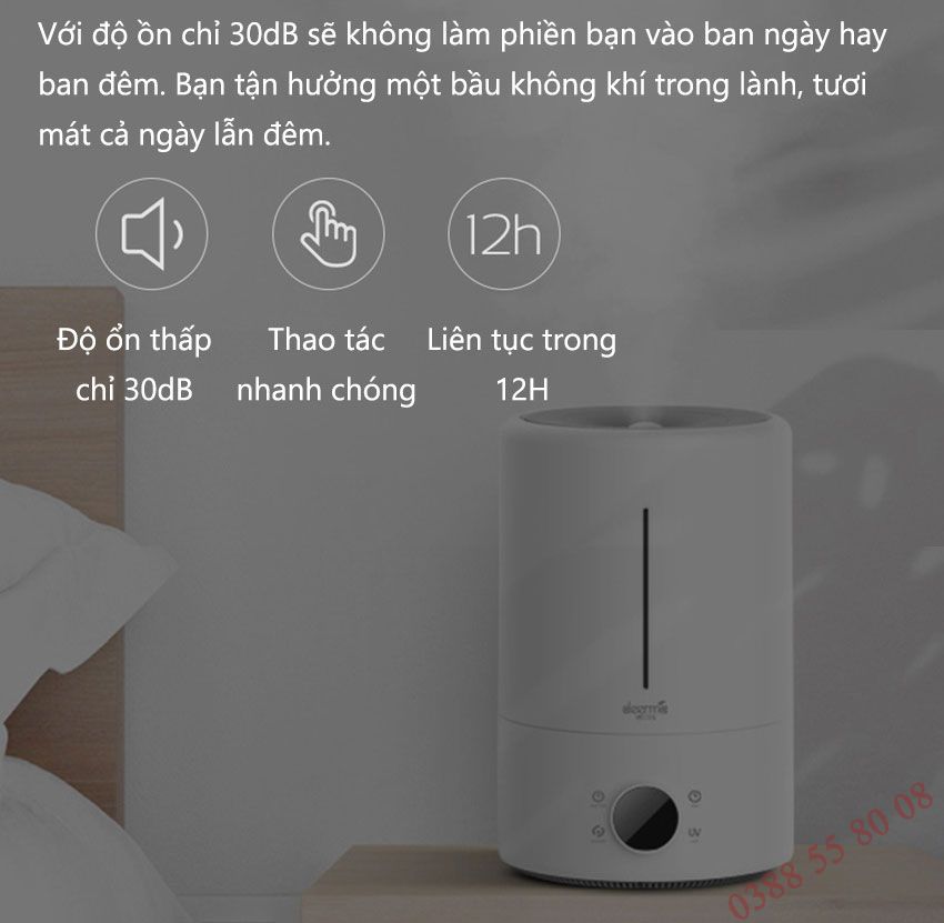 Mặc dù công suất hoạt động mạnh mẽ tuy nhiên máy tạo độ ẩm Deerma vẫn hoạt động êm ái ở mức dưới 30dB, không làm ảnh hưởng đến cuộc sống của bạn, nhất là giấc ngủ vào ban đêm. Đặc biệt, vào thời gian nghỉ ngơi bạn hãy nhấn và giữ nút hẹn giờ trong khoảng 3s thì màn hình sẽ tắt, tránh ánh sáng chói, ảnh hưởng đến giấc ngủ.