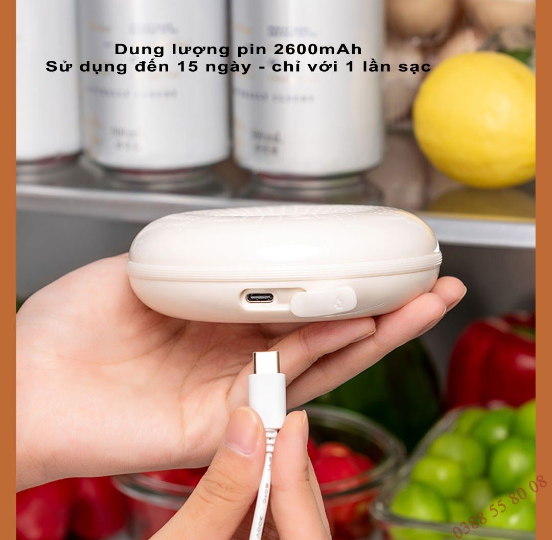 Máy khử trùng tủ lạnh của Lofans được tích hợp viên pin 2600mAh, cho tuổi thọ sử dụng lâu dài. Cụ thể, chỉ với 6 giờ sạc đầy, sản phẩm cho thời gian sử dụng ở chế độ khử mùi lên tới 15 ngày và chế độ tiệt trùng, khử mùi sâu là 7 ngày, đáp ứng nhu cầu sử dụng cơ bản mà không cần phải thay thế lõi lọc.