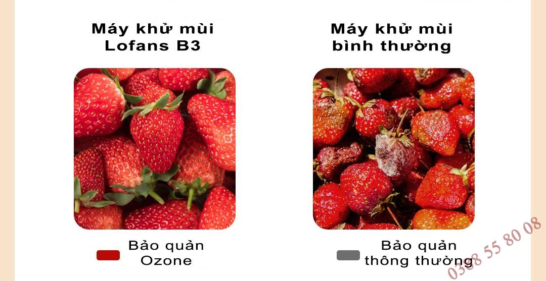 Tính năng khử trùng sâu được nâng cấp, giúp phân hủy mùi đặc biệt, đồng thời giảm thiểu mùi hôi khó chịu. Bên cạnh ưu điểm tiệt trùng và khử mùi, Lofans B3 còn có thể ức chế các chất làm chín như Ethylen trên bề mặt rau củ để kéo dài độ tươi của thực phẩm, cho thời gian bảo quản lâu hơn.