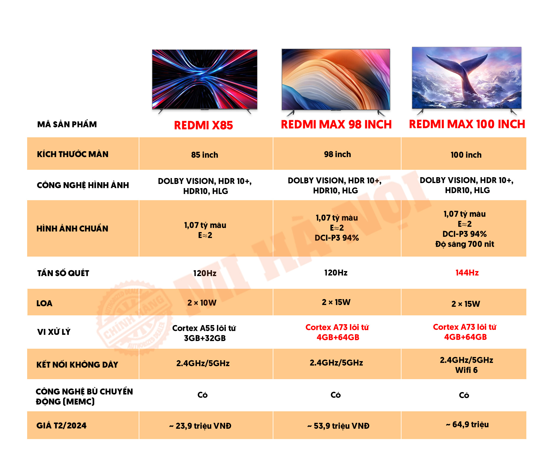 Tivi Xiaomi Redmi Max 100 inch – Độ phân giải 4K, Bộ nhớ 4+64GB, Tần sô 144Hz
